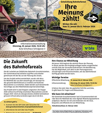 Wie soll sich das Bahnhofareal Grosshöchstetten künftig entwickeln? Die Gemeinde lädt die Bevölkerung ein, sich an der Planung zu beteiligen und ihre Ideen einzubringen.Erinnerung Themen-Anlässe "Sicher ist sicher"