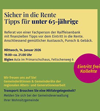 Am Mittwoch findet der dritte Themen-Anlass "Sicher ist sicher" statt. Das Thema: Sicher in die Rente. Tipps für unter 65-jährigeTeilrevision Ortsplanung – öffentliche Planauflage