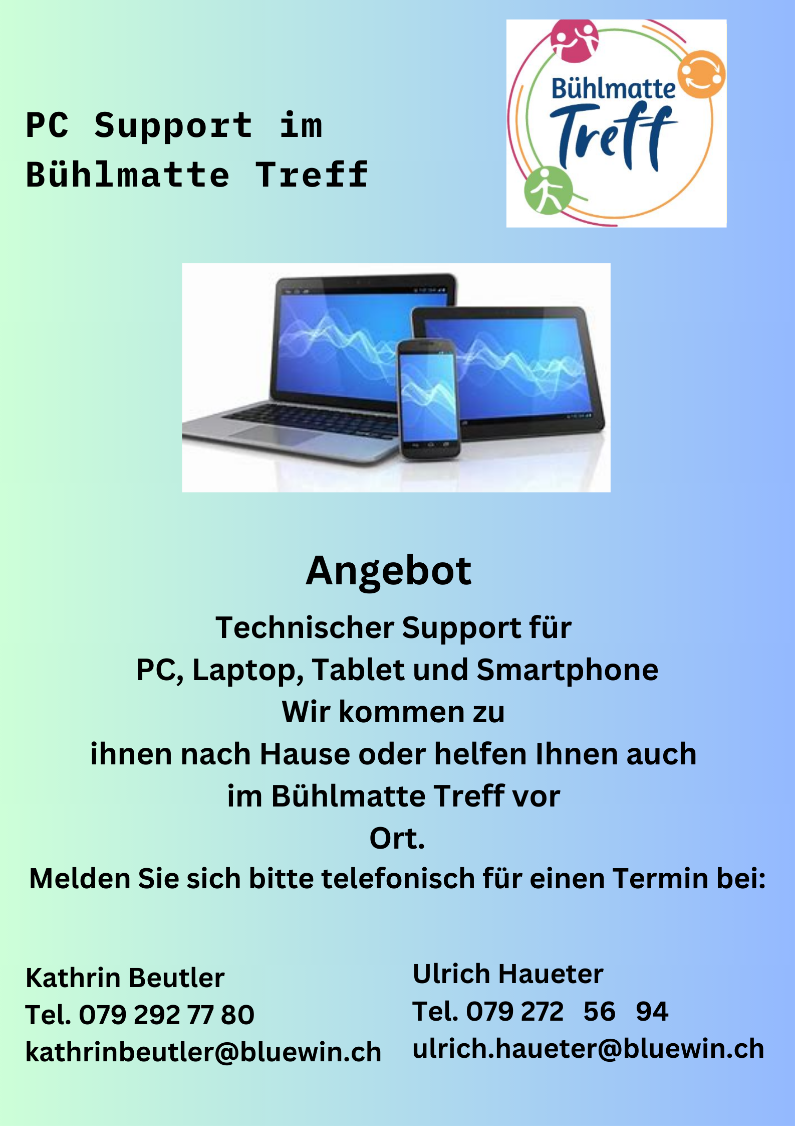 Falls Sie interessiert sind mitzuwirken, melden Sie sich bei der Leitung des Bühlmatte Treffs.